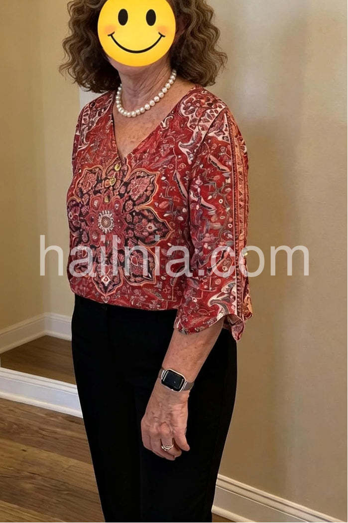 Yes!It runs true to the garment size chart please choose your size based on your measurements.A vibrant bohemian blouse featuring an intricate red paisley print. This elegant top showcases a classic V-neckline adorned with delicate buttons, adding a touch of sophistication. The three-quarter length flared sleeves create a flowy, feminine silhouette, perfect for both casual outings and more dressed-up occasions. Crafted from lightweight, breathable fabric, it ensures comfort all day long.
