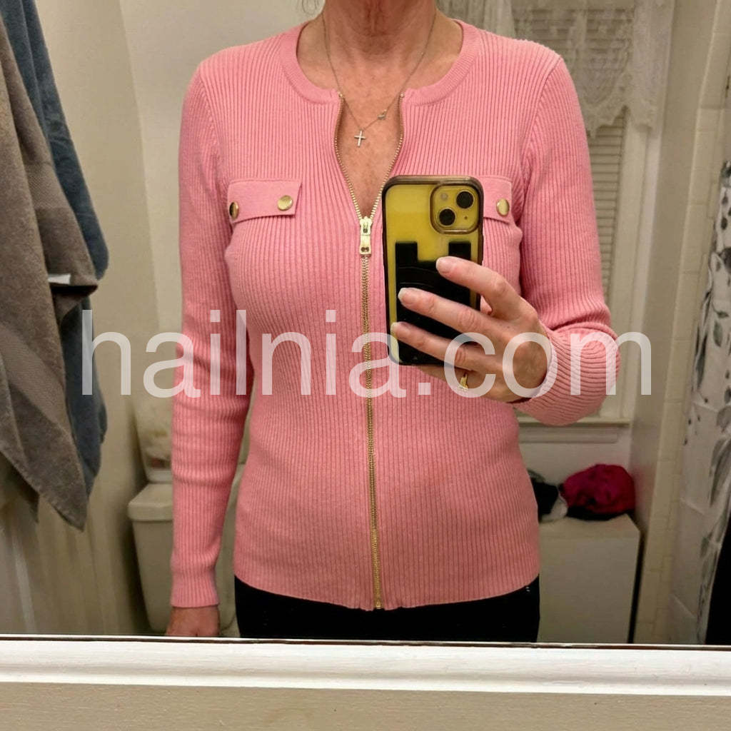 Sweet Pink Plain Zip V-Neck Knit Top